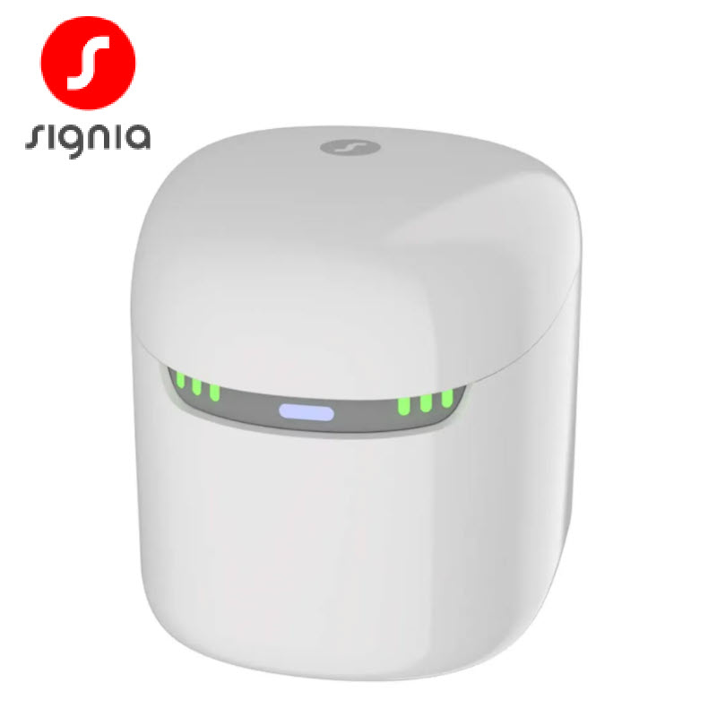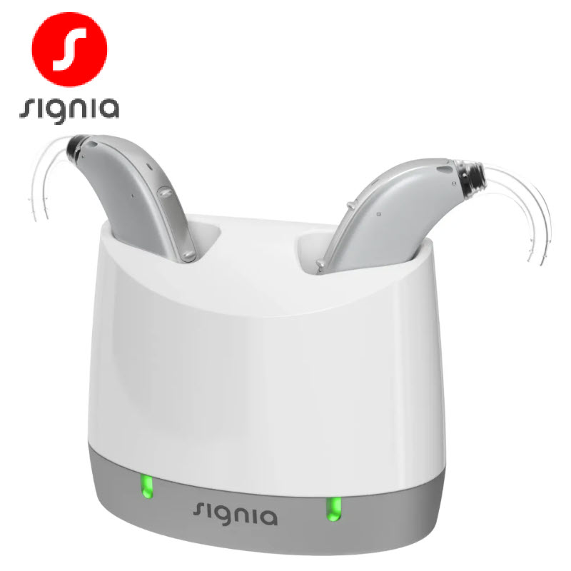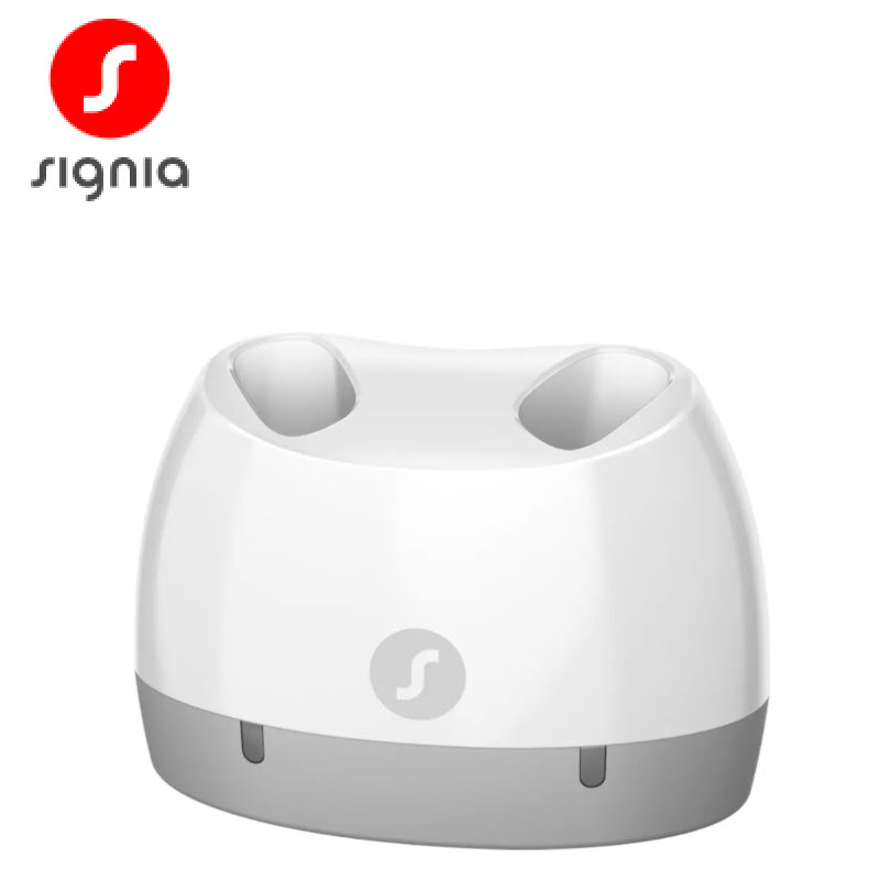 The Signia charger displays a flashing green light to indicate that it is correctly in place and charging. A solid green light indicates charging is complete.