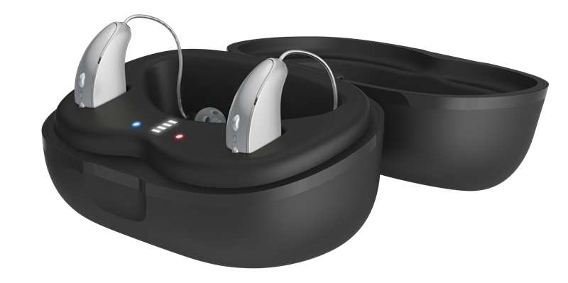 Two chargers are available for Starkey Omega AI hearing aids: a standard charger that must be plugged in to charge. There is also a premium charger with an onboard lithium-ion battery for on-the-go charging.